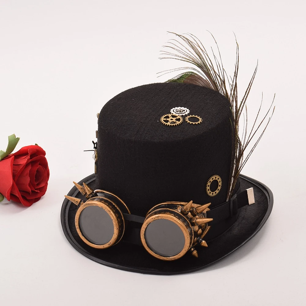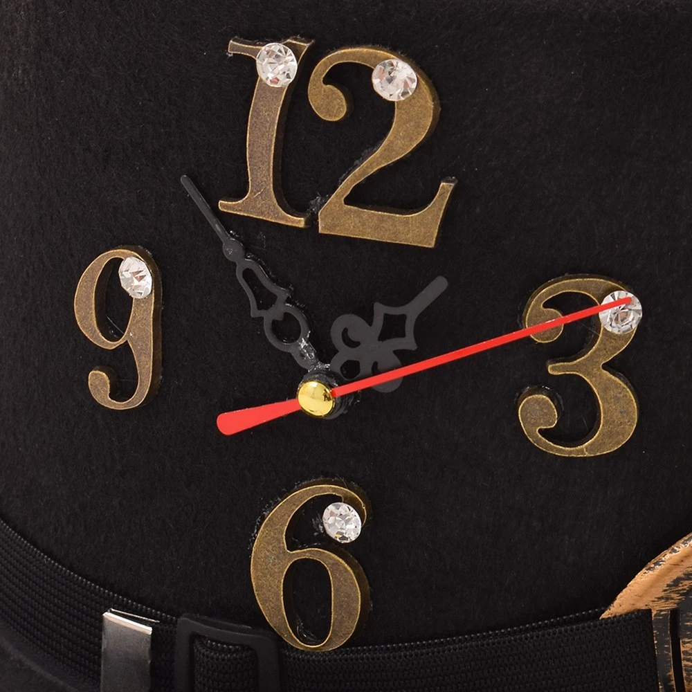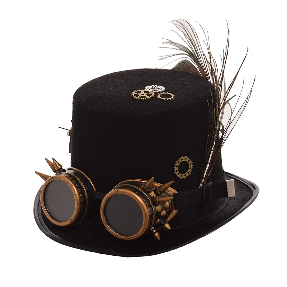 Ce chapeau Steampunk rétro noir à horloge très original vous habillera de façon élégante et unique à la fois. Sa grande plume et son horloge sur le côté feront toutes son originalité. Les lunettes à piques et les décorations en engrenages renforceront le style pour un chapeau dans le thème.
